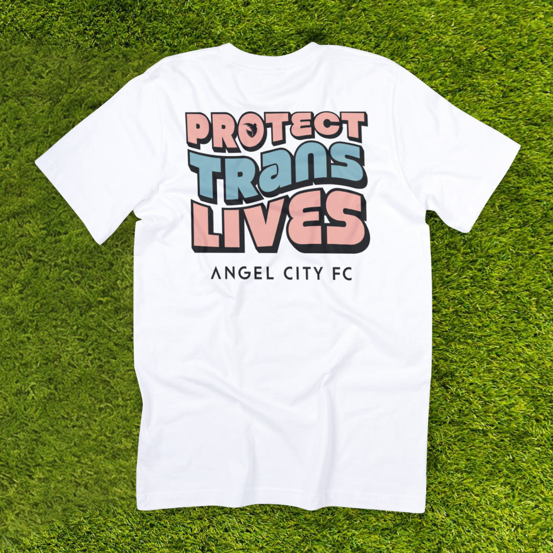 La camiseta presenta el mismo gráfico audaz de Protect Trans Lives en la parte delantera y trasera, y está hecha con los colores de la comunidad trans, rosa y azul. El gráfico también presenta el emblema ACFC dentro de la O y la marca denominativa Angel City FC en negro en la parte inferior.