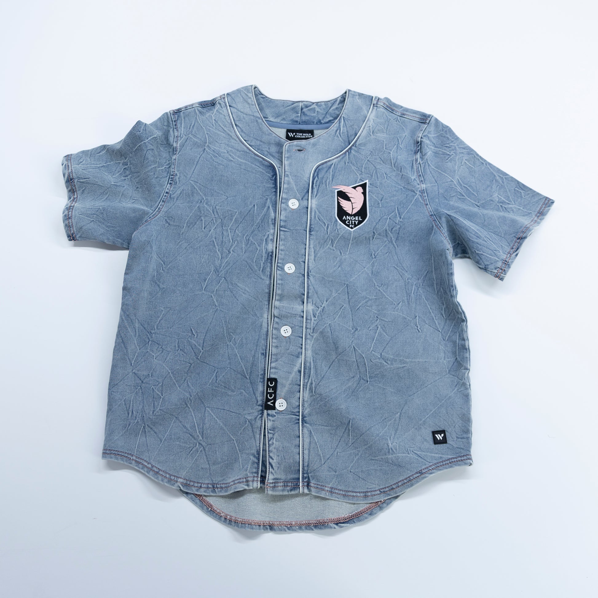 Anima a tu equipo con nuestra camiseta de béisbol con botones de mezclilla unisex Angel City FC x Wild Collective, que presenta un escudo del ACFC bordado en el escudo y un bordado en la espalda.