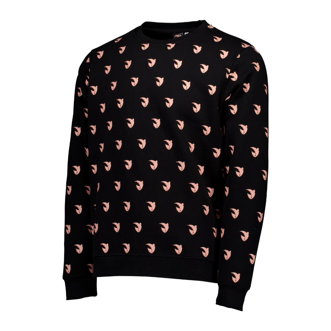 Cheer on your ACFC squad in our bold Angel City FC Mens All-Over Emblem Print Black Crewneck Sweater. The crewneck sweater features the Angel City FC Emblem printed in Sol Rosa in an all-over patter and black ribbed wrists, hem, and neckline.