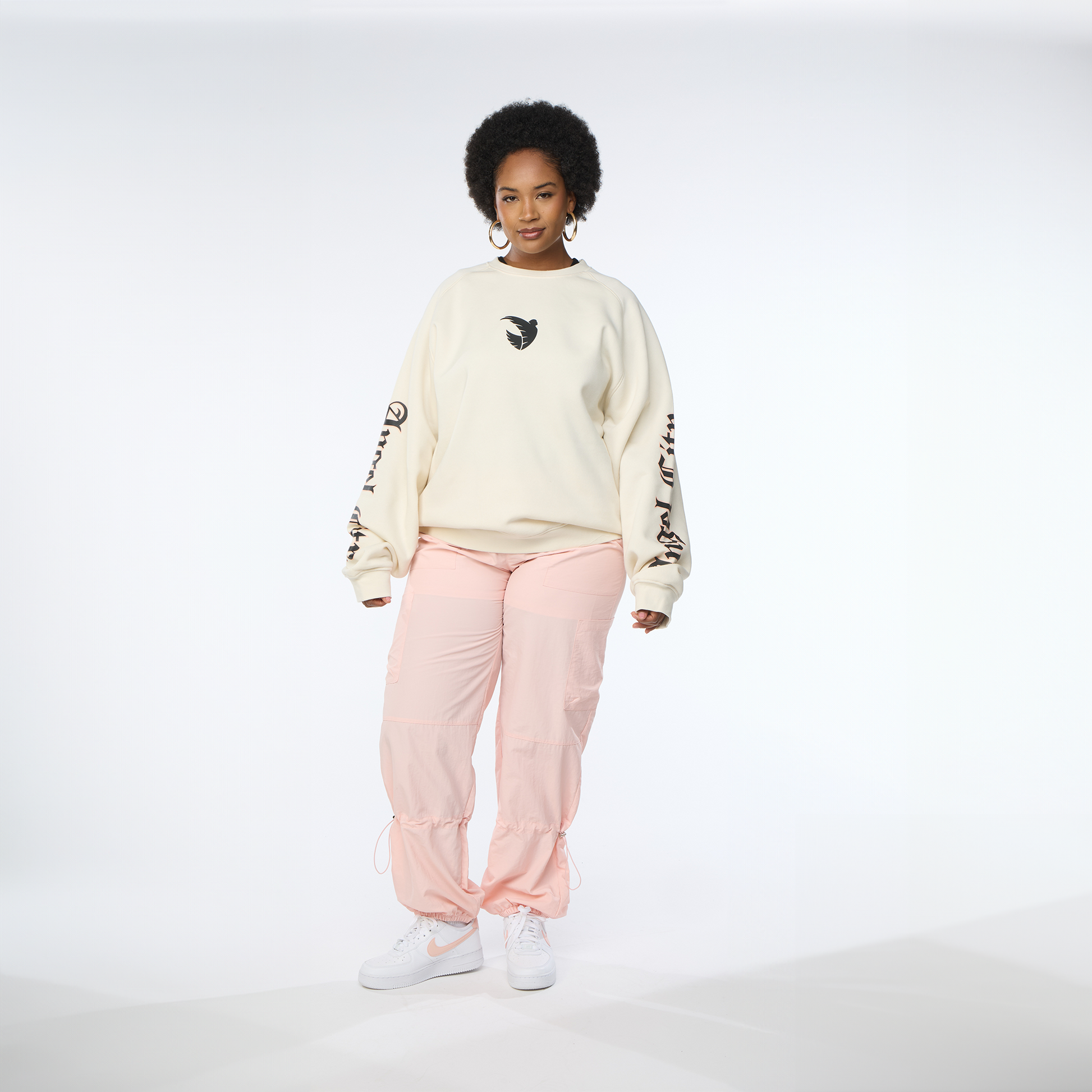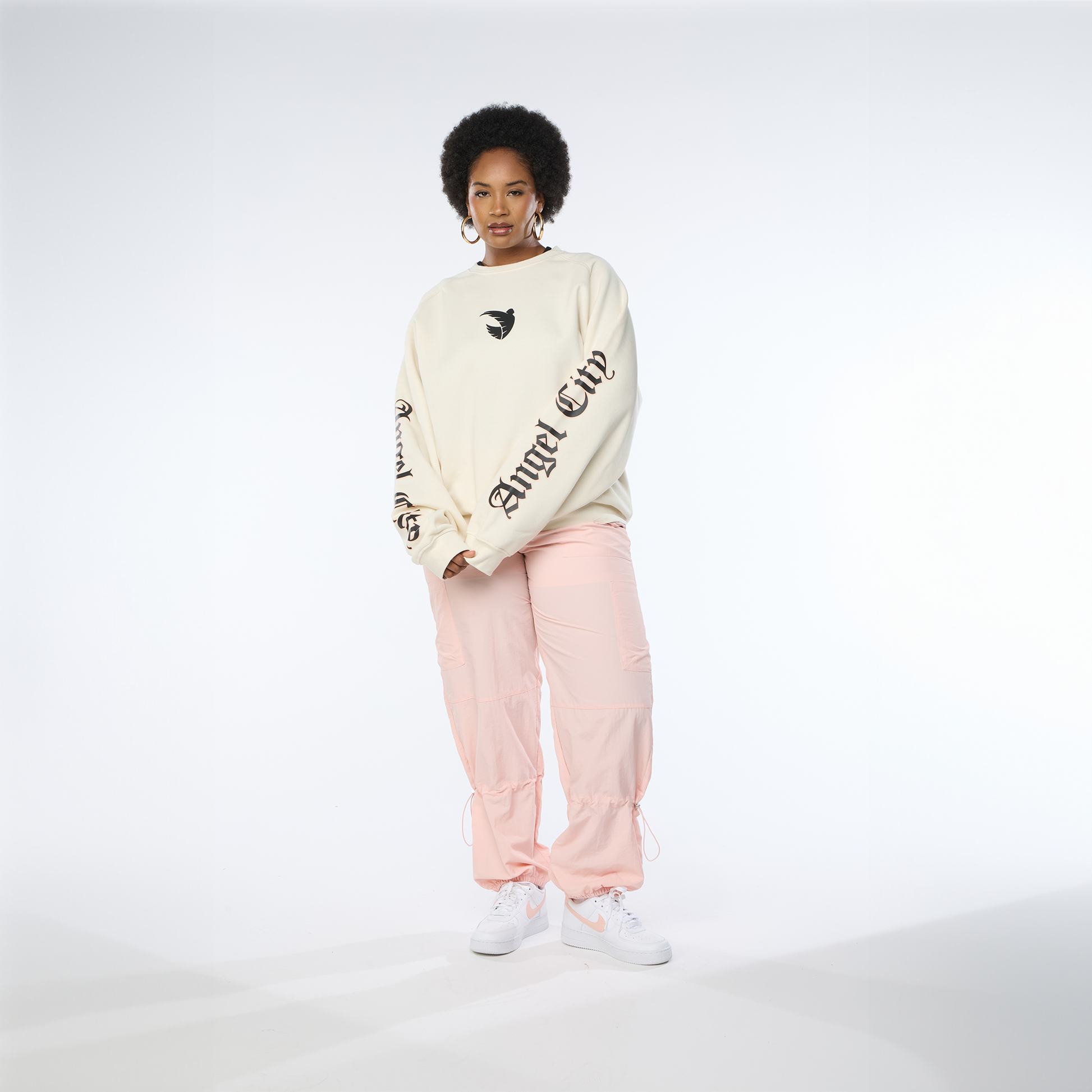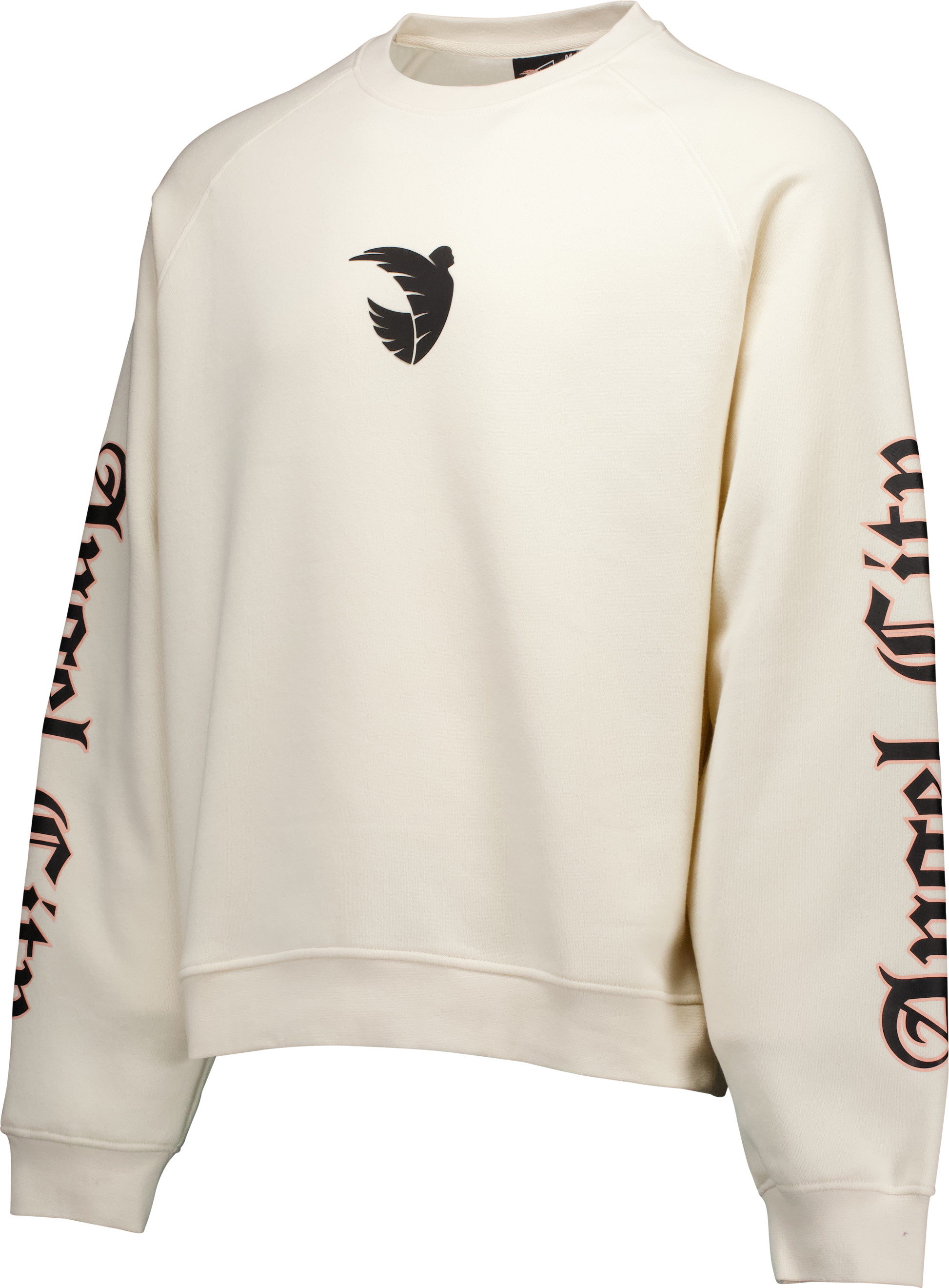 Cheer on your ACFC squad in our Angel City FC Unisex Old English Off-White Oversized Crewneck Sweater, featuring a black emblem on the front and Angel City in Old English going down both sleeves.